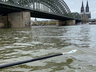 Am dritten Tag hatten wir das schlechteste Wetter und den meisten Wind – aber sind nicht wirklich nass geworden. Dafür gab es eine spektakuläre Aussicht vom Wasser aus auf Köln. Der Dom war für mich das Beeindruckendste – er zeigte sich im Sonnenschein von seiner besten Seite. Jede Menge Menschen saßen am Rhein und winkten uns zu und wir ruderten und ruderten und ruderten. Meine Bootsmitfahrer waren eine wunderbare Truppe, hier und da ein entspanntes Päuschen … reden, lachen, gucken, staunen ... Dennoch waren die letzten 10 km die Schwersten der ganzen Reise. Irgendwann ließ die Kraft etwas nach, aber ... got it - made it ...